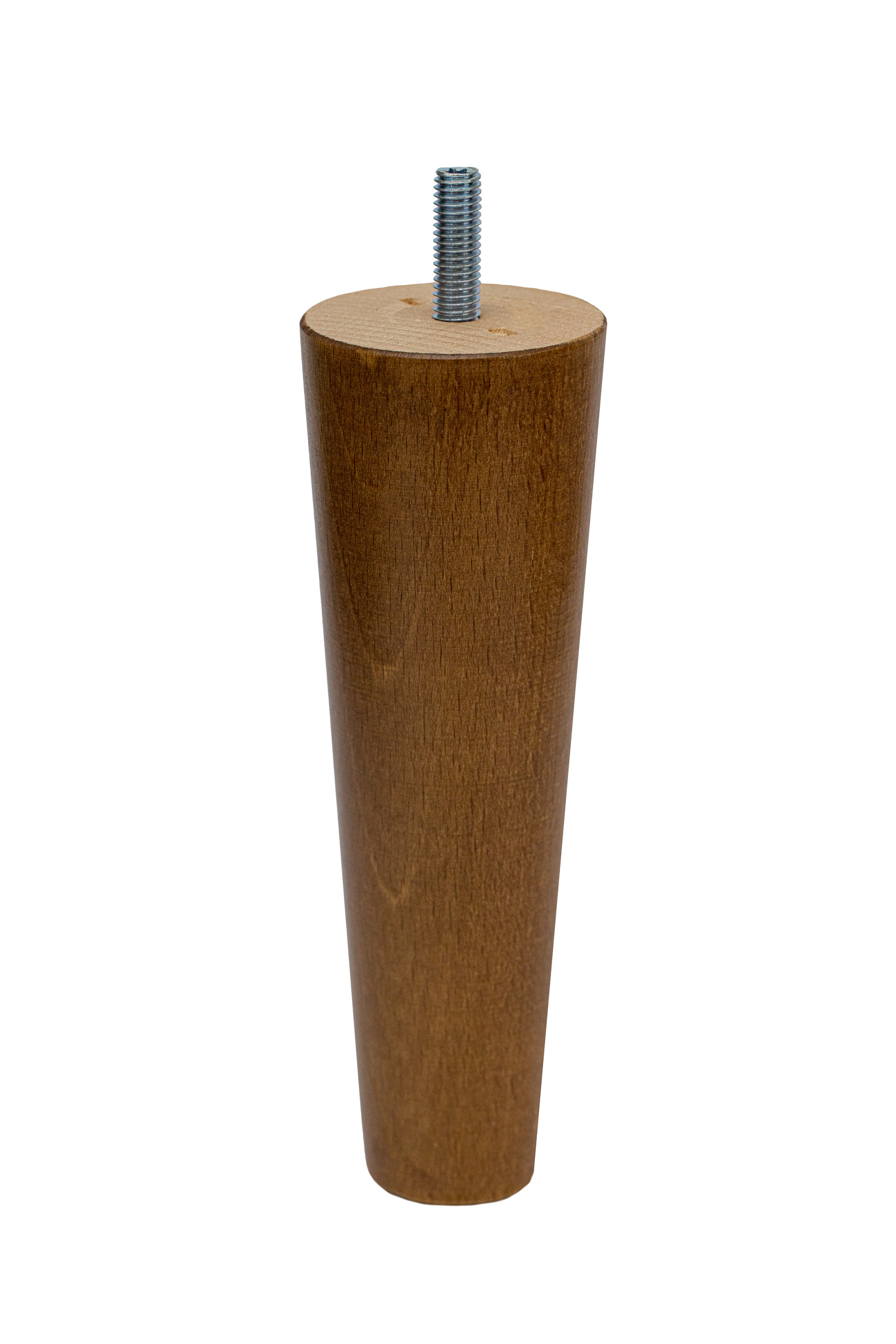 Drewniana noga meblowa w kształcie stożka, wykonana z wysokiej jakości drewna bukowego, ma wysokość 100 mm oraz średnicę podstawy górnej wynoszącą 50 mm i dolnej 30 mm. Noga meblowa posiada wkręconą śrubę z gwintem metrycznym M8, która wystaje 25 mm. Noga nie wymaga skomplikowanego montażu. Dzięki wkręconej szpilce, może być zamontowana w meblu w łatwy sposób za pomocą: blachy montażowej, nakrętki pazurkowej, bądź nakrętki rampy. Niezbędne akcesoria montażowe znajdują się także w naszej ofercie.