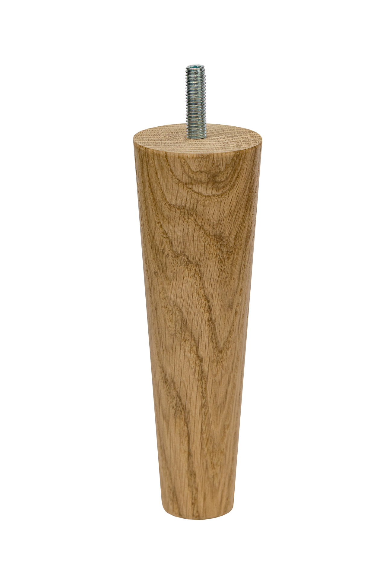 Stożkowaty kształt nogi nadaje jej smukły i elegancki wygląd, szersza podstawa zwęża się stopniowo ku dołowi. Drewno dębowe, z którego została wykonana, charakteryzuje się dużą twardością i wytrzymałością, co sprawia, że noga jest solidna i odporna na uszkodzenia. Noga drewniana o kształcie stożka jest zdecydowanie bardziej subtelna od nóg prostokątnych. Nadaje meblom lekkości, przy zachowaniu ich odpowiedniej stabilności.
