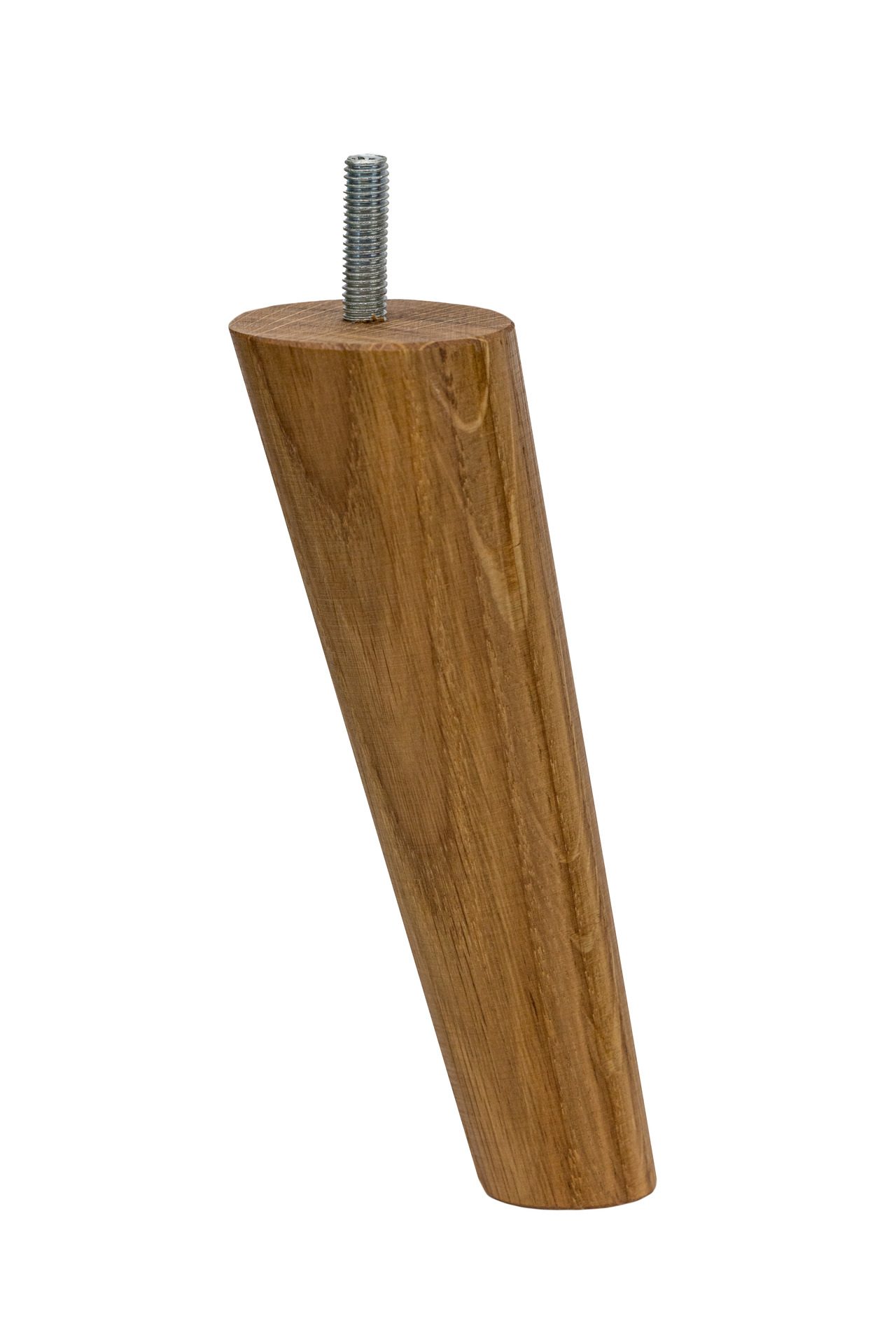 Drewniana noga meblowa w kształcie stożka, wykonana z wysokiej jakości drewna dębowego, ma wysokość 150 mm oraz średnicę podstawy górnej wynoszącą 48 mm i dolnej 30 mm. Noga meblowa posiada wkręconą śrubę z gwintem metrycznym M8, która wystaje 25 mm. Noga nie wymaga skomplikowanego montażu. Dzięki wkręconej szpilce, może być zamontowana w meblu w łatwy sposób za pomocą: blachy montażowej, nakrętki pazurkowej, bądź nakrętki rampy. Niezbędne akcesoria montażowe znajdują się także w naszej ofercie.