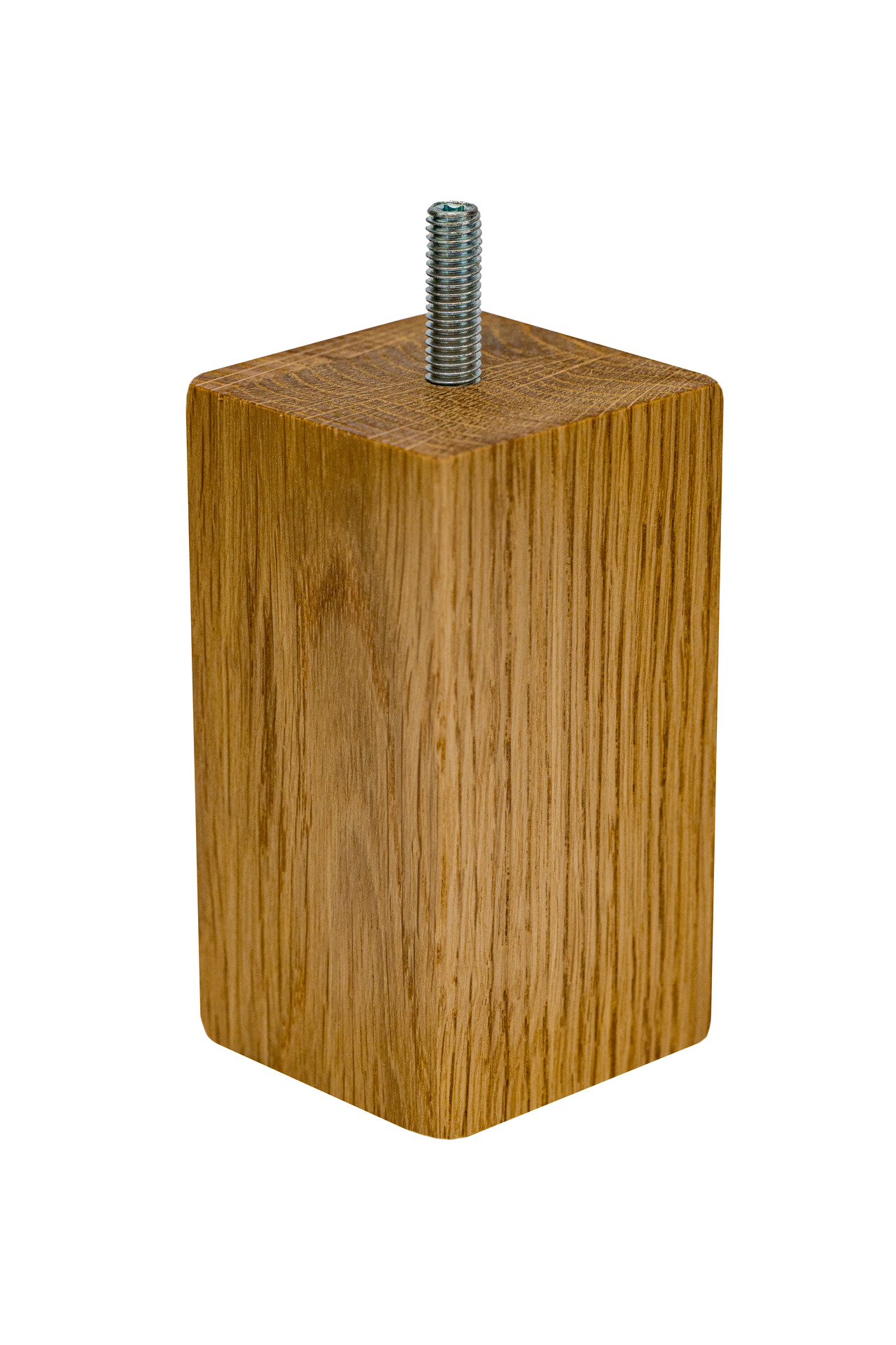 Noga meblowa prostokątna kostka, wykonana z wysokiej jakości drewna dębowego, o wysokości 100 mm i przekroju 55×55 mm. Noga meblowa posiada wkręconą śrubę z gwintem metrycznym M8, która wystaje 25 mm. Noga nie wymaga skomplikowanego montażu. Dzięki wkręconej szpilce, może być zamontowana w meblu w łatwy sposób za pomocą: blachy montażowej, nakrętki pazurkowej, bądź nakrętki rampy. Niezbędne akcesoria montażowe znajdują się także w naszej ofercie.