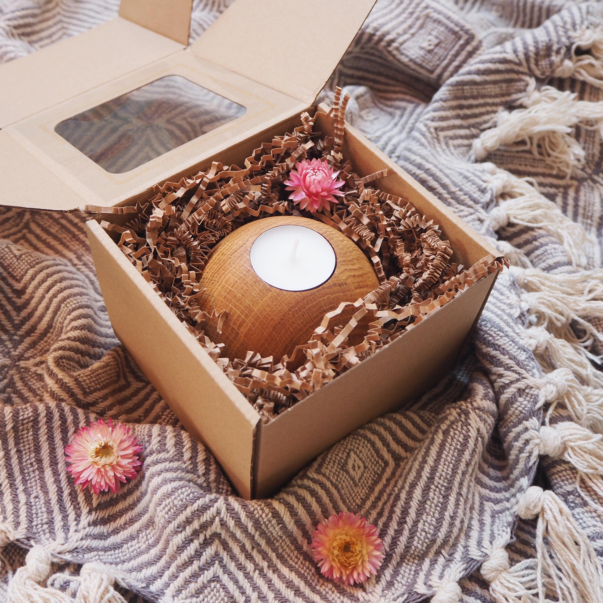 Zgodnie ze współczesnym trendem proekologicznym, świecznik zapakowany jest w eleganckie, eko pudełko z okienkiem, przez które widać zawartość prezentu. W środku znajduje się papierowy wypełniacz o delikatnie brązowym odcieniu, który doskonale komponuje się z kolorystyką naturalnego drewna dębowego. Pudełko może zostać oplecione sznurkiem jutowym bądź kolorową wstążką – wybór pozostawiamy Tobie. Do sznurka/wstążki dołączamy eko bilecik, na którym możesz zapisać kilka miłych słów obdarowywanej osobie bądź po prostu umieścić życzenia. Całość zapakowana jest niezwykle starannie, z dbałością o każdy szczegół.