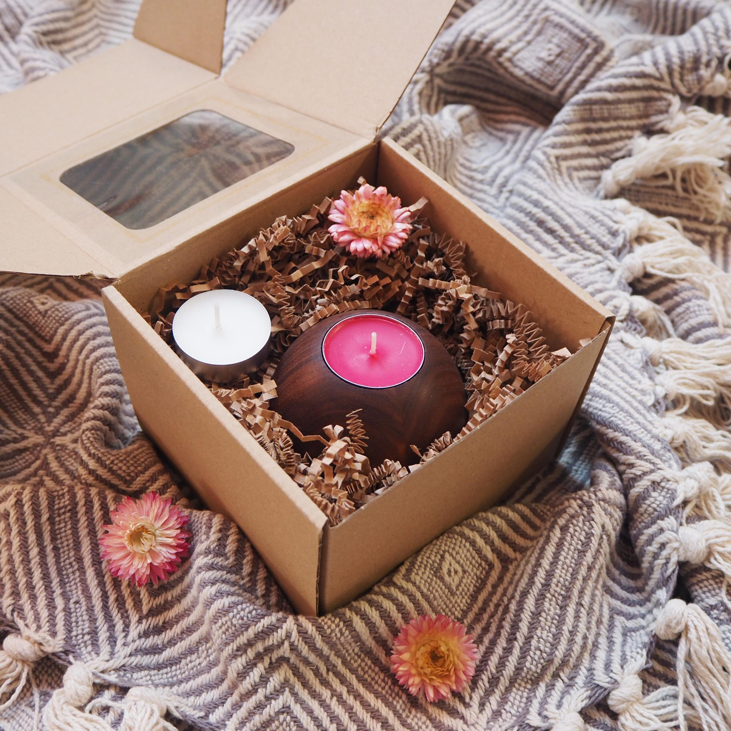 Zgodnie ze współczesnym trendem proekologicznym, świecznik zapakowany jest w eleganckie, eko pudełko z okienkiem, przez które widać zawartość prezentu. W środku znajduje się papierowy wypełniacz o delikatnie brązowym odcieniu, który doskonale komponuje się z kolorystyką naturalnego drewna orzecha amerykańskiego. Pudełko może zostać oplecione sznurkiem jutowym bądź kolorową wstążką – wybór pozostawiamy Tobie. Do sznurka/wstążki dołączamy eko bilecik, na którym możesz zapisać kilka miłych słów obdarowywanej osobie bądź po prostu umieścić życzenia. Całość zapakowana jest niezwykle starannie, z dbałością o każdy szczegół.