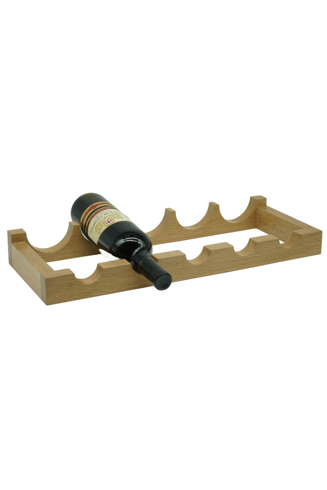 Drewniany stojak na wino, wykonany z wysokiej jakości drewna dębowego, o długości 51,5 cm, szerokości 20,5 cm i maksymalnej wysokości 6 cm, który pomieści 5 butelek wina/szampana.