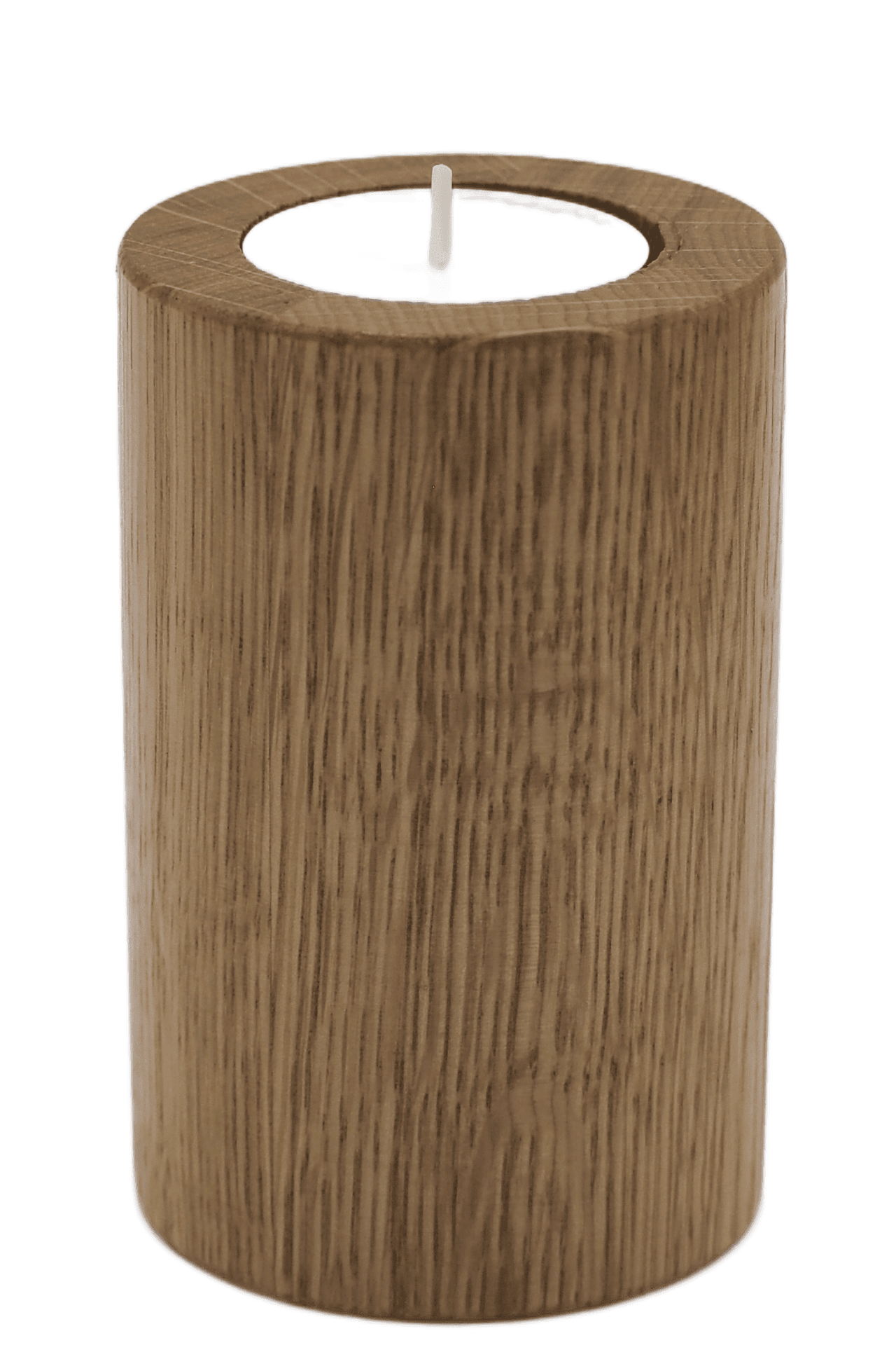 Drewniany świecznik walec na świece podgrzewacze (typu tealight), wykonany z wysokiej jakości drewna dębowego. Świecznik o wysokości 100 mm oraz średnicy 65 mm.